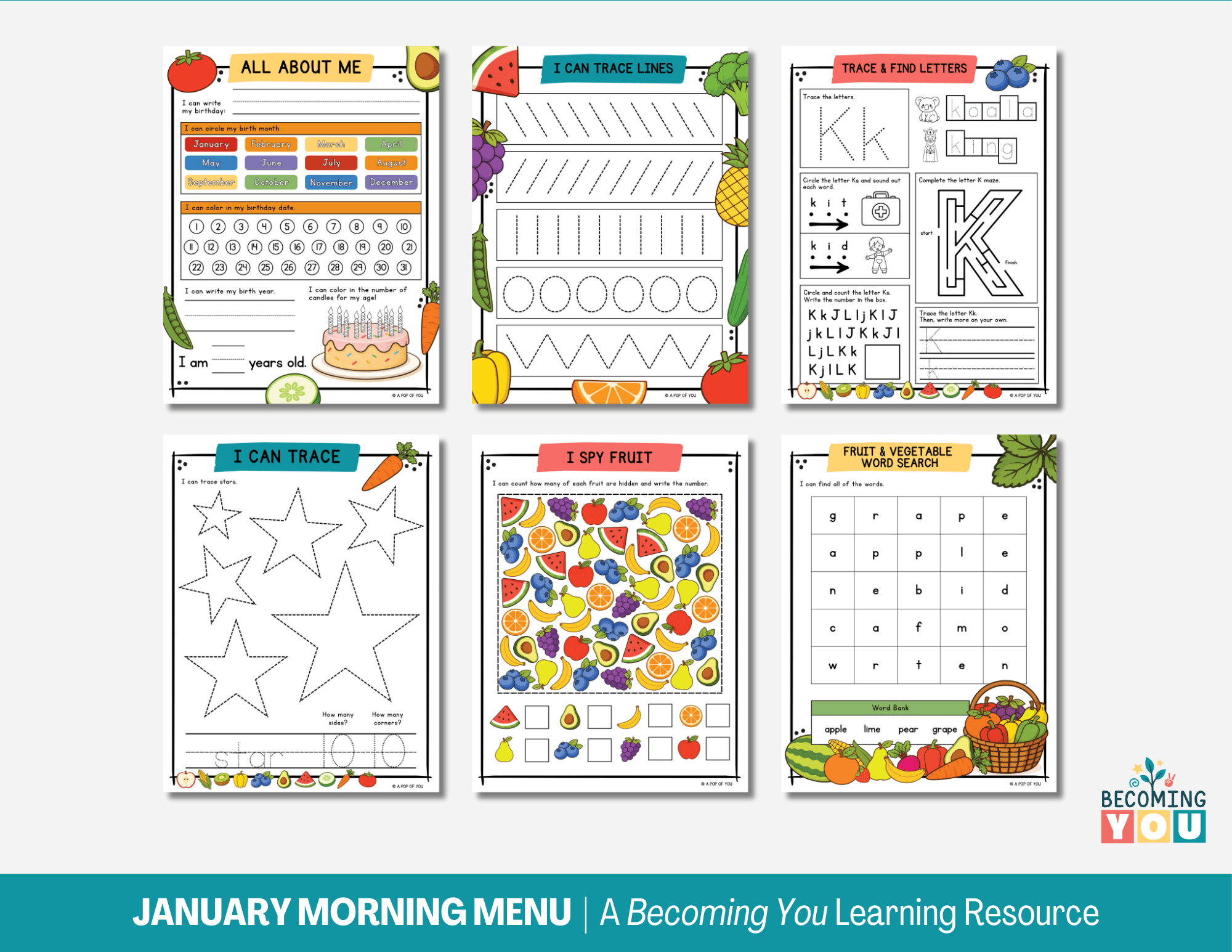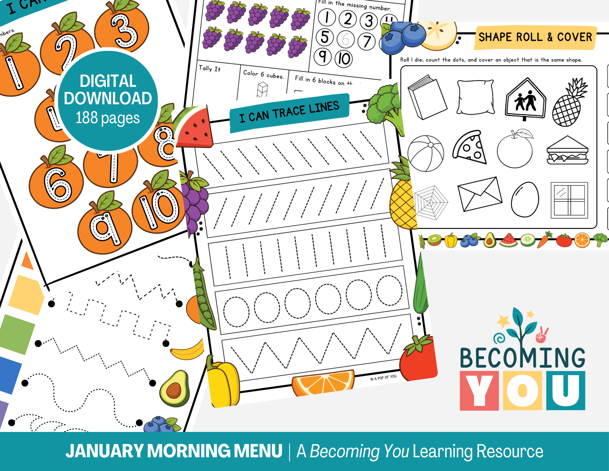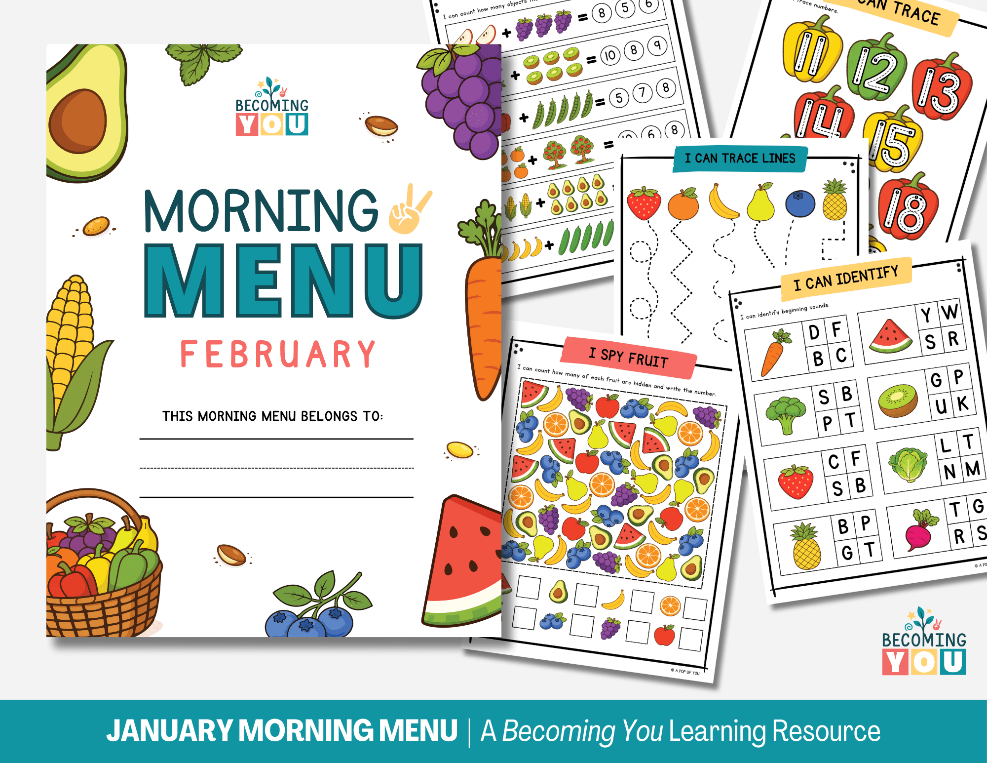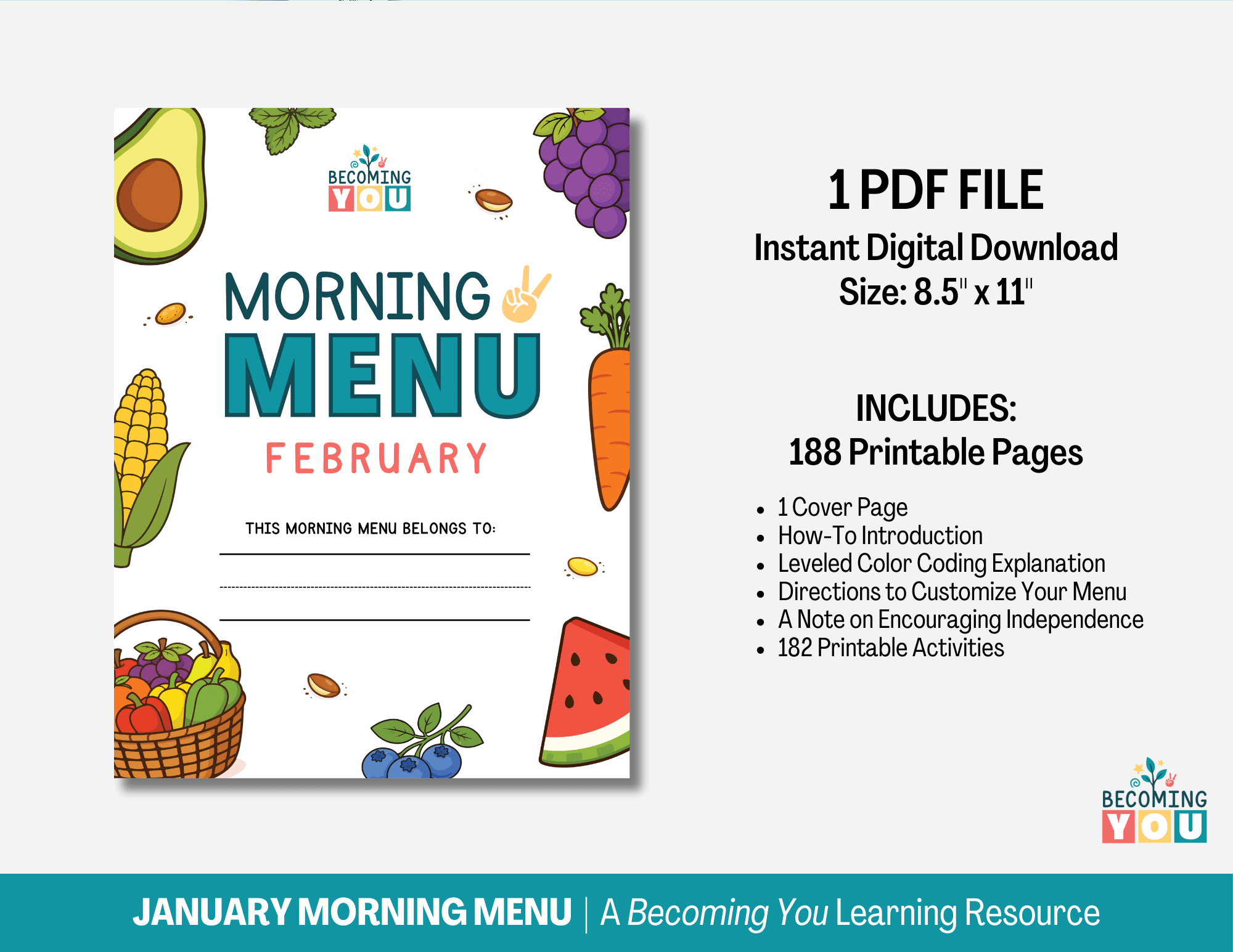 Create calm, consistent mornings with the February Morning Menu—a 194-page printable resource designed for preschool and early elementary learners. Filled with screen-free, fruit and vegetable–themed activities, this menu includes daily affirmations, early literacy and math practice, tracing, calendar work, and simple hands-on learning. It encourages children to engage independently while building focus, confidence, and routine. Designed to support predictable, low-stress mornings, the February Morning Menu offers an easy, structured way to start each day—giving children a clear beginning to their morning and parents the space to move through the day with less overwhelm.