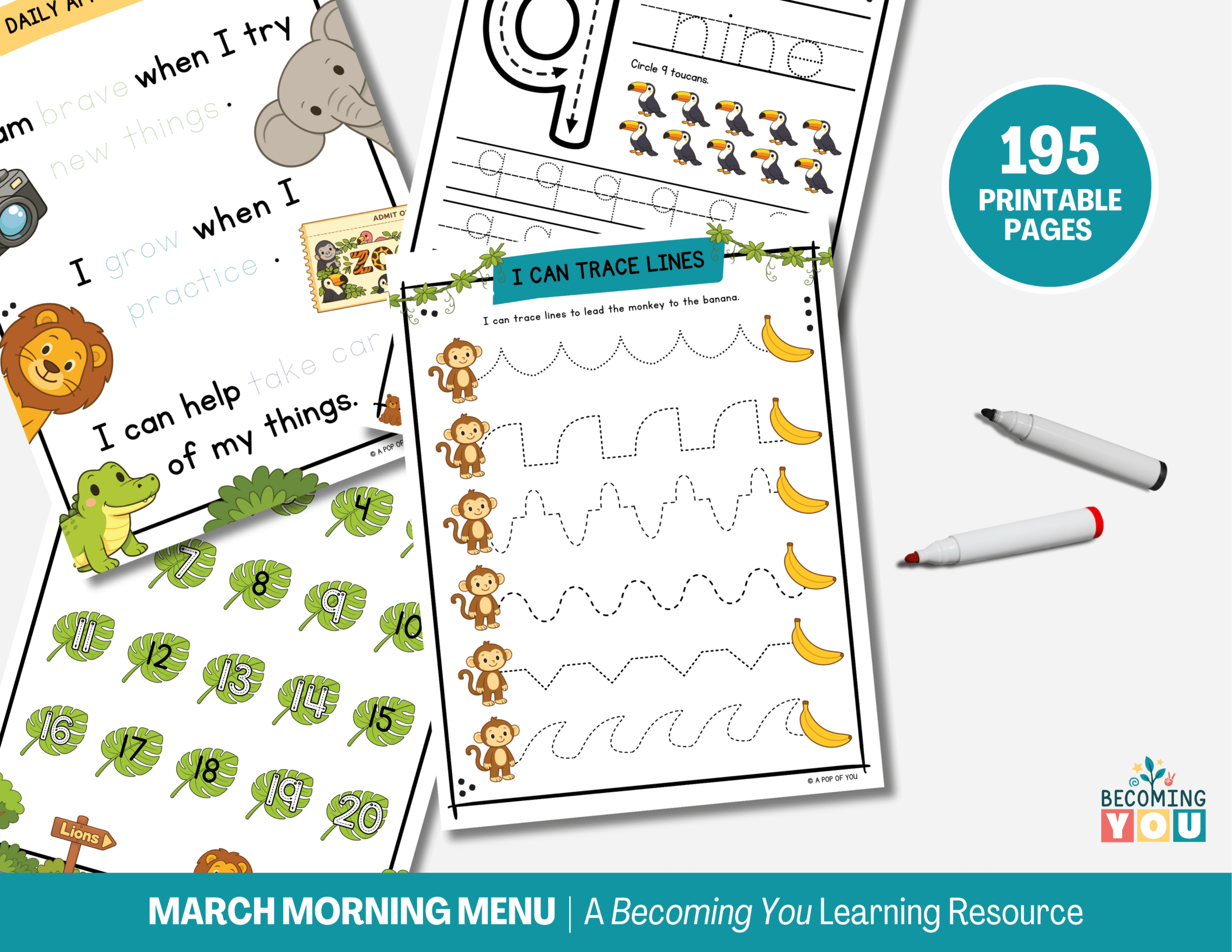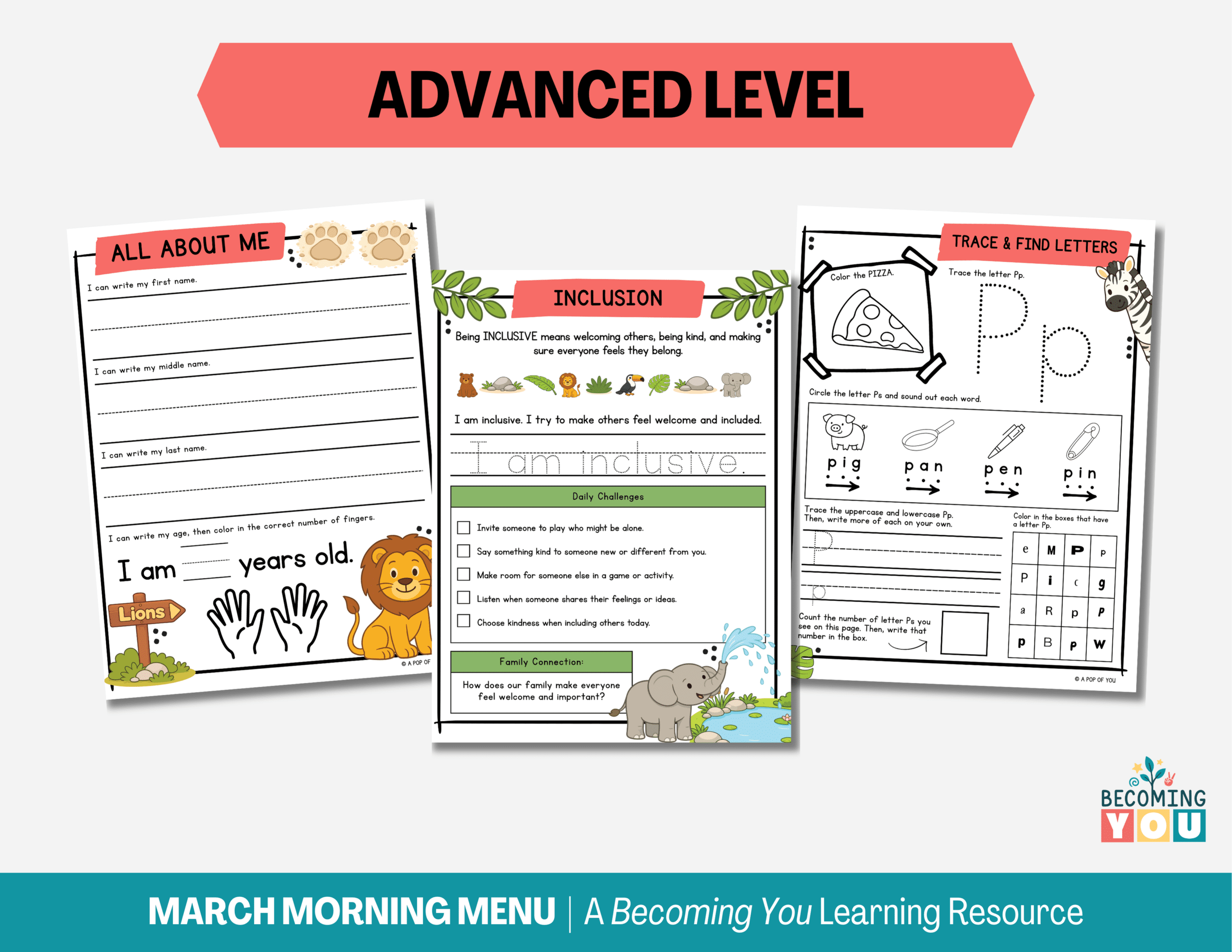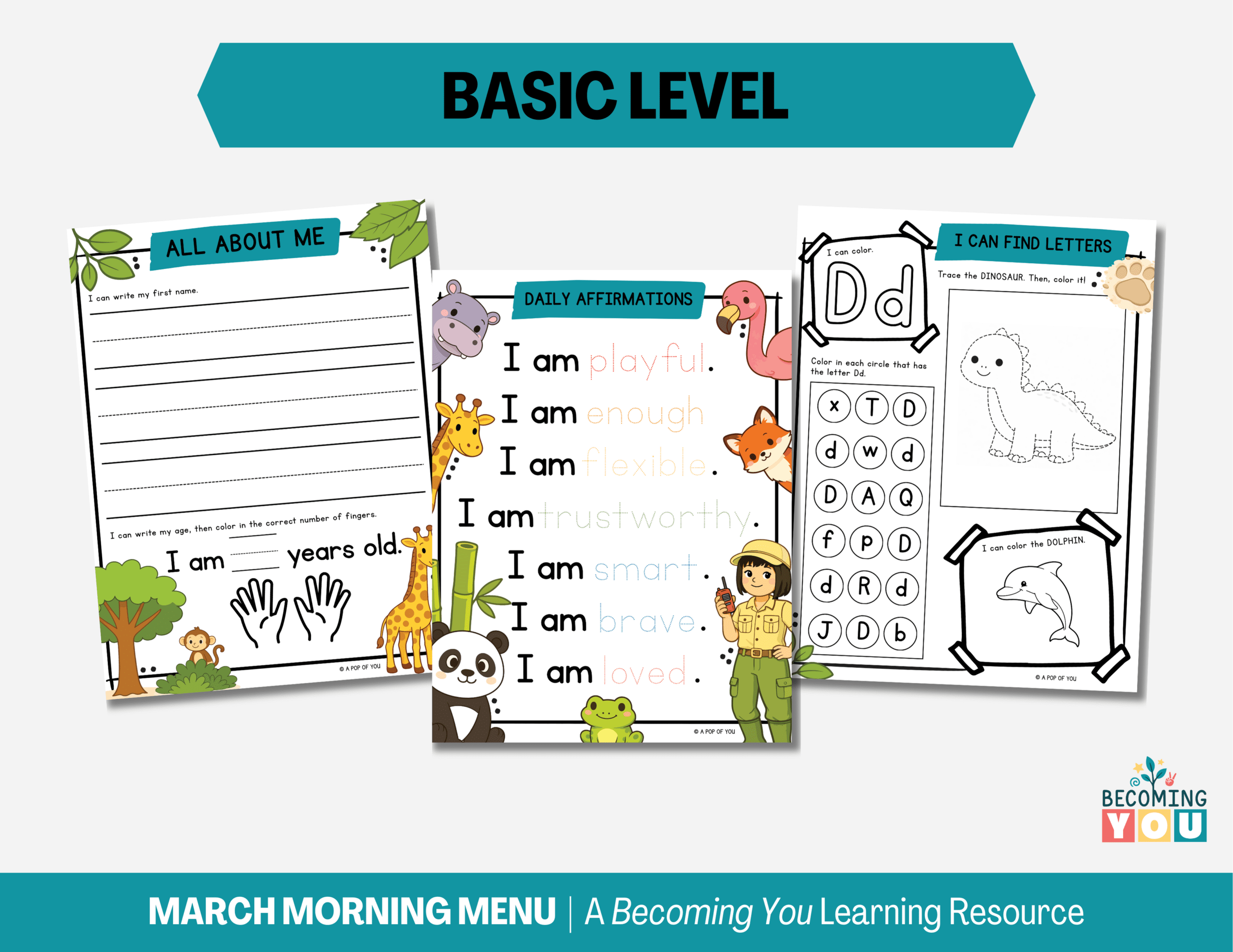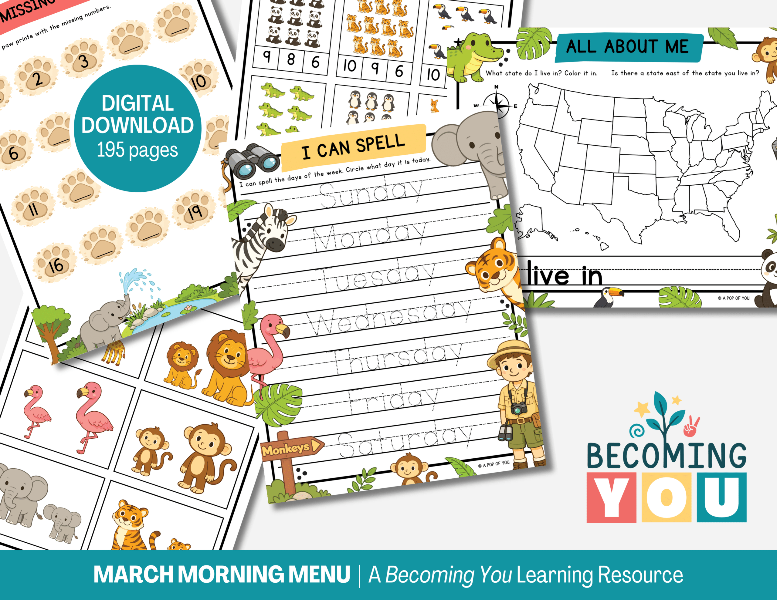Welcome spring with calm, consistent mornings using the March Morning Menu, a 195-page printable resource designed for preschool and early elementary learners. This zoo animal–themed menu features engaging daily routines like All About Me, Calendar, Weather, Feelings, Character Traits, Gratitude, and Daily Affirmations, along with meaningful literacy and math practice including alphabet work, beginning and ending sounds, rhyming words, CVC words, spelling, tracing, counting, number of the day, simple addition, patterns, and a NEW Roll & Color Number Match activity. Designed to build independence, focus, and confidence, it provides children with purposeful, hands-on learning while giving parents the gift of a smoother, more peaceful start to the day.