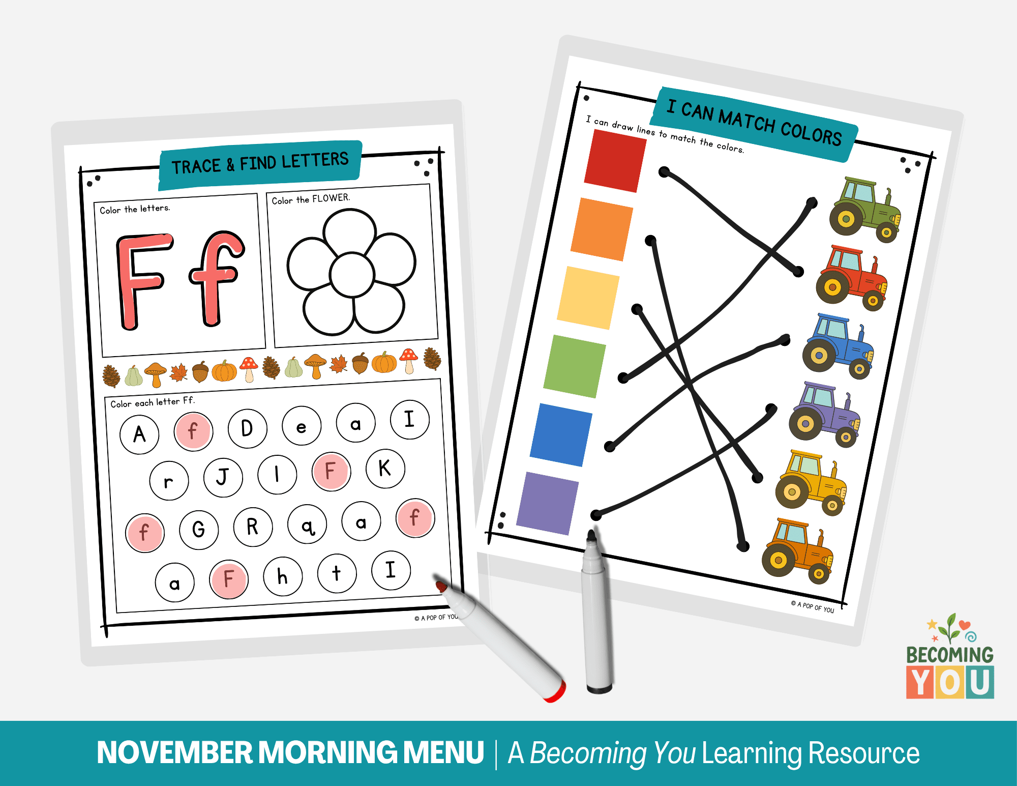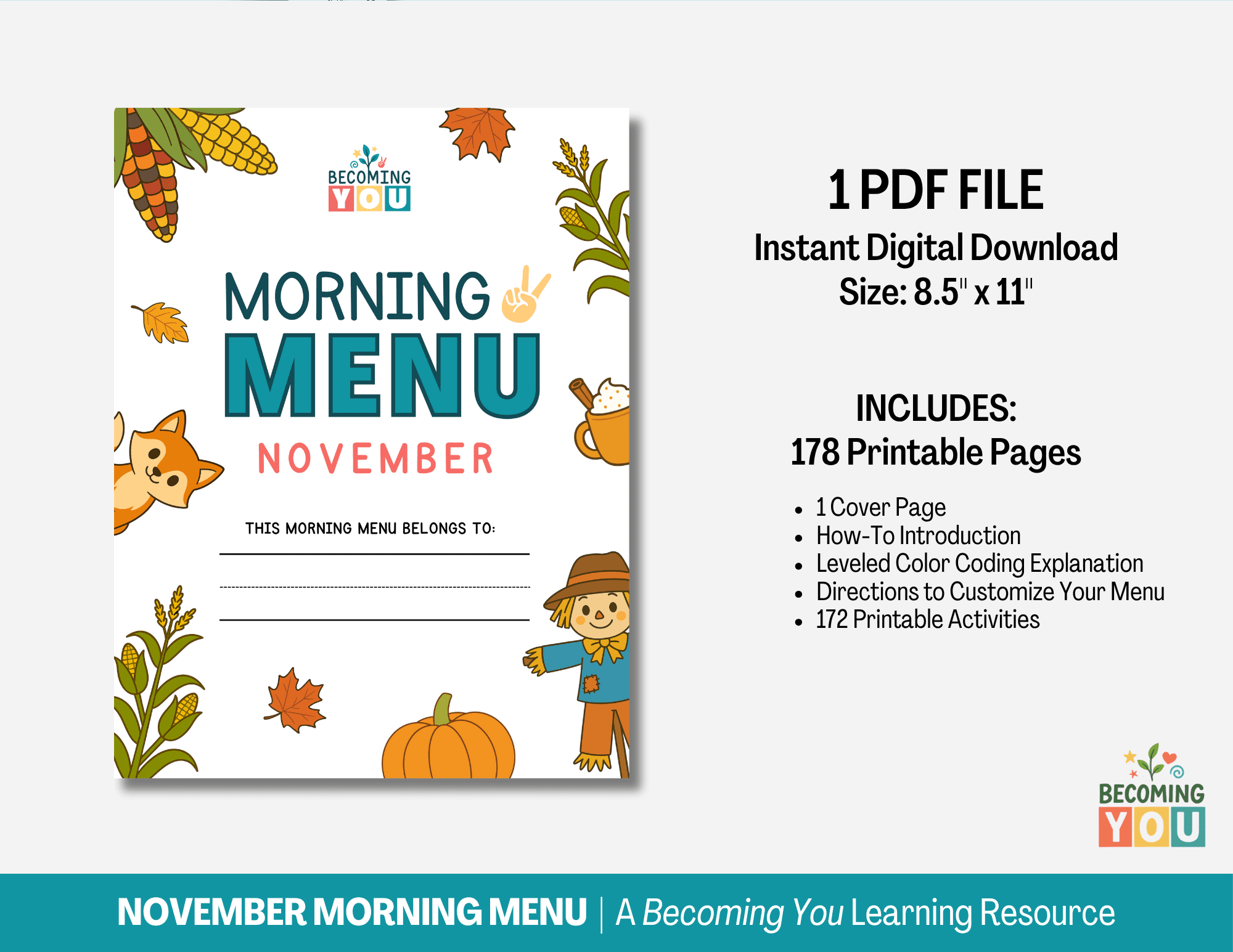 Created by a former elementary teacher and mom of three, this resource has been tested and refined at the family table to fit the needs of busy households. The seasonal November themes keep kids excited, while the reusable format makes it easy to swap and rotate pages for ongoing variety. With quick prep and simple supplies, the Morning Menu builds structure, independence, and confidence for kids—while giving parents the gift of a smoother start to the day.