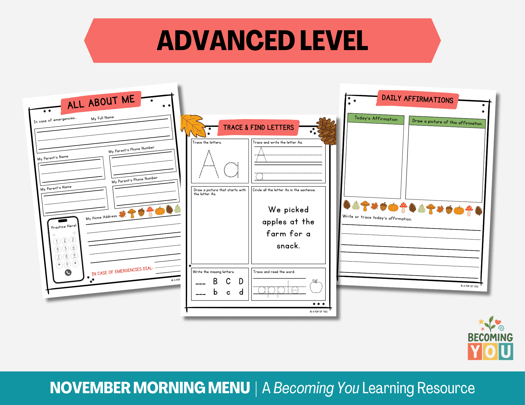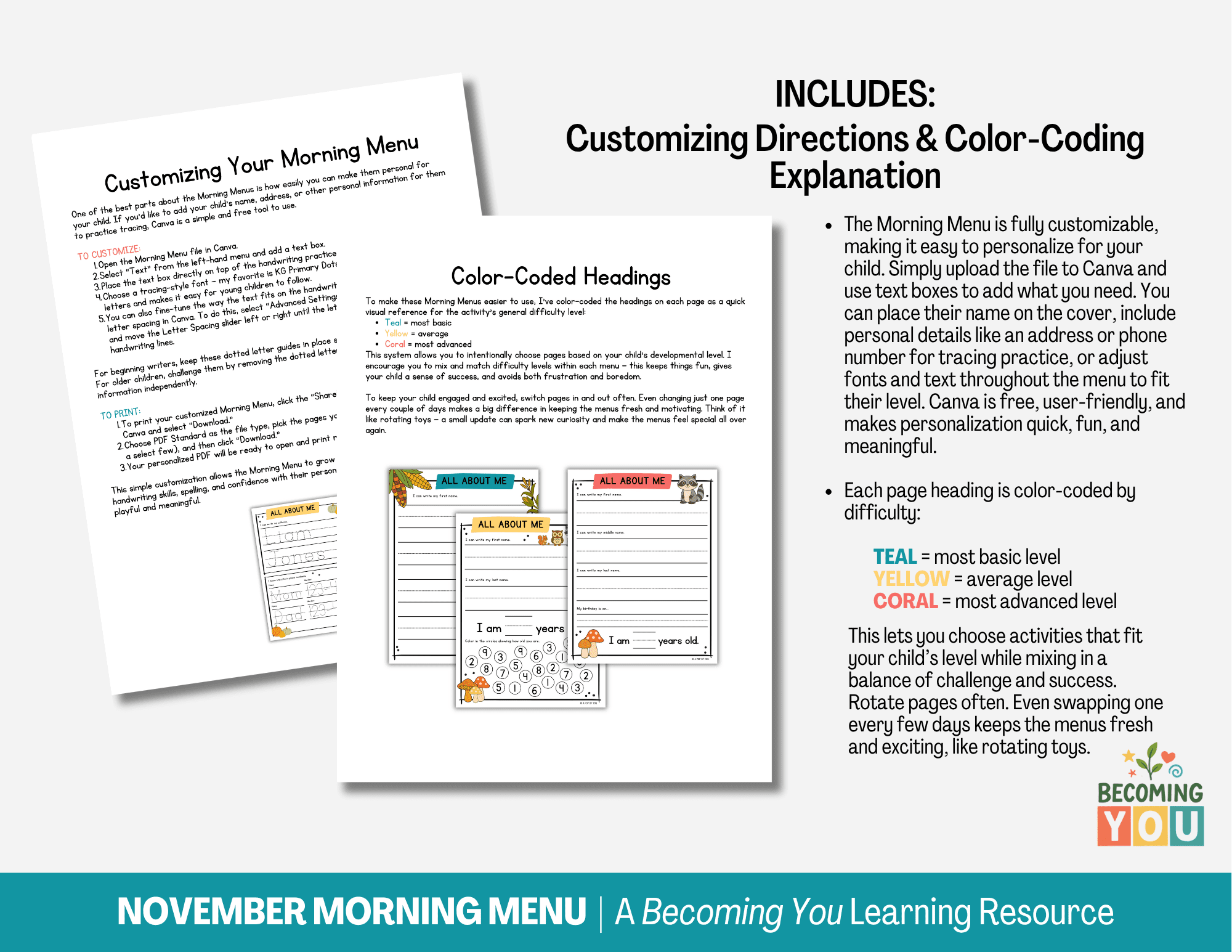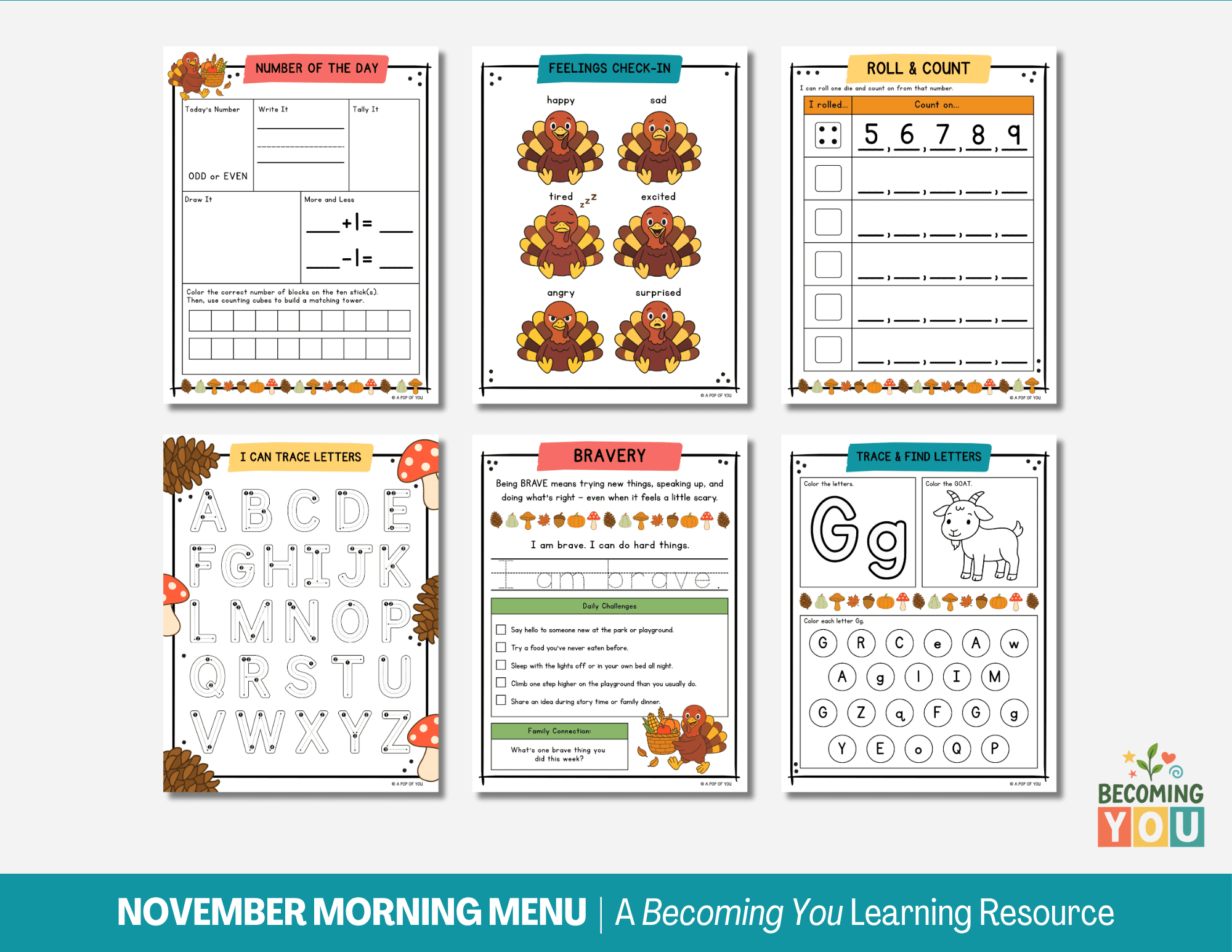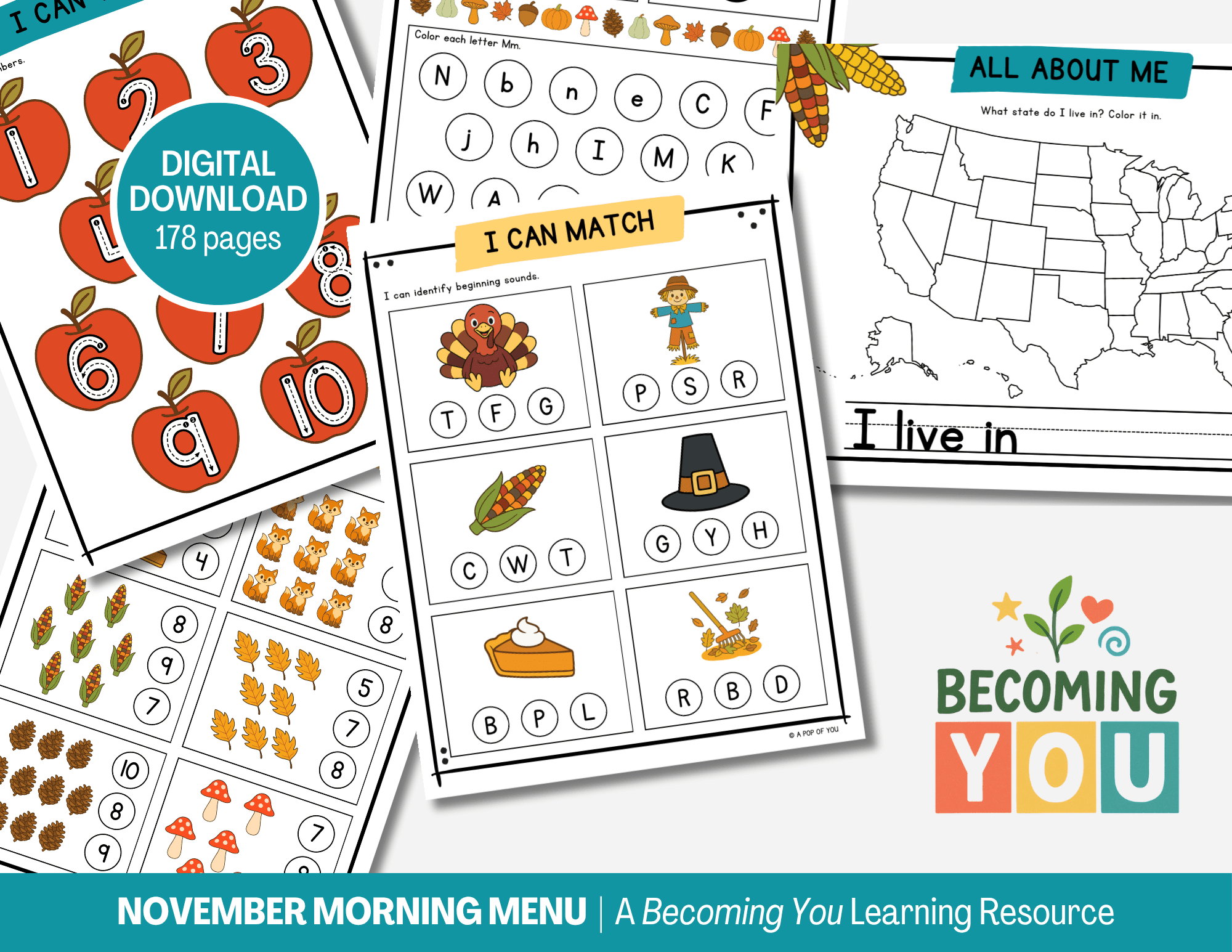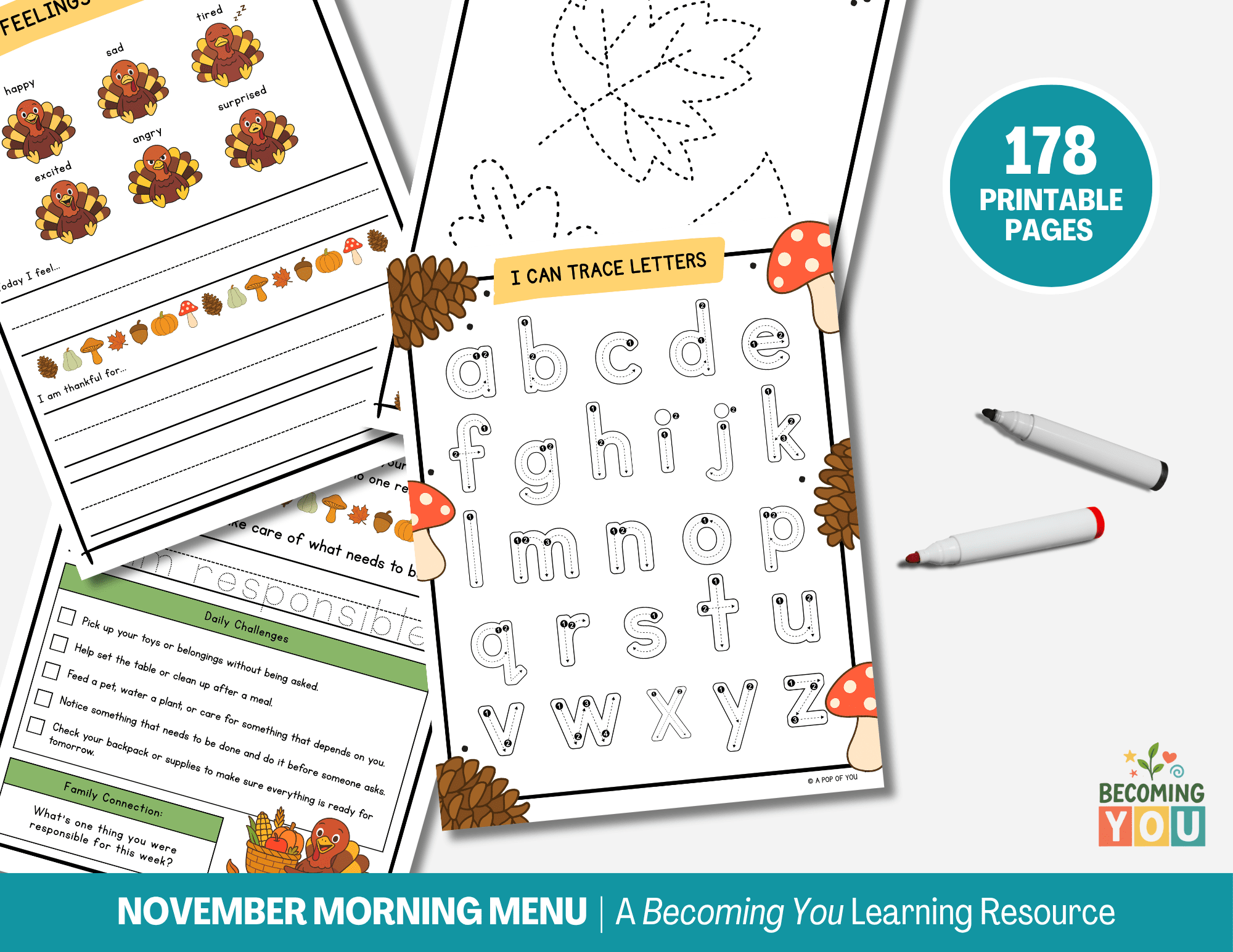 Bring calm and connection to your mornings with the November Morning Menu—a 178-page printable packed with screen-free activities for preschool and early elementary kids. Includes literacy, math, affirmations, tracing, calendar, weather, and more. Perfect for busy families wanting smoother, intentional mornings with less stress and more joy.